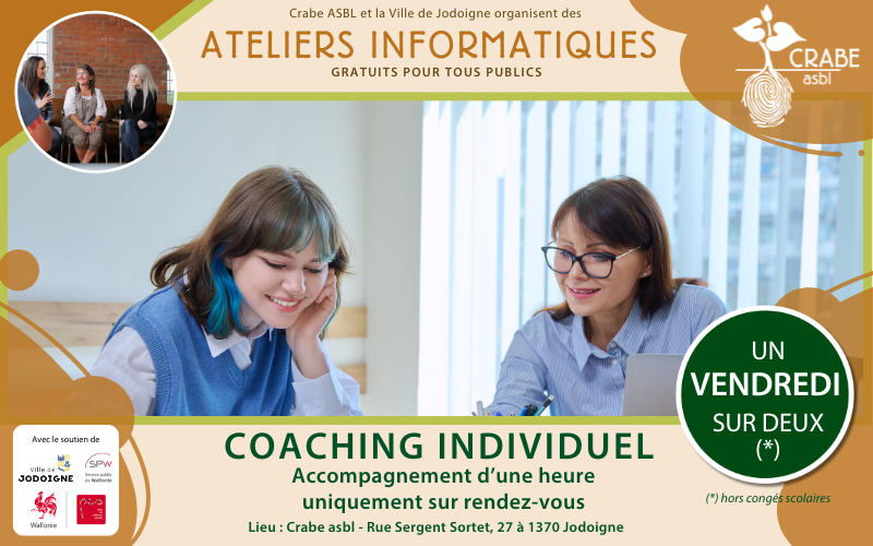 Dans le cadre du Plan de Cohésion Sociale de la Ville de Jodoigne, le Crabe dispense en ses locaux tous les vendredis après-midi (hors congés scolaires) des ateliers informatiques pour